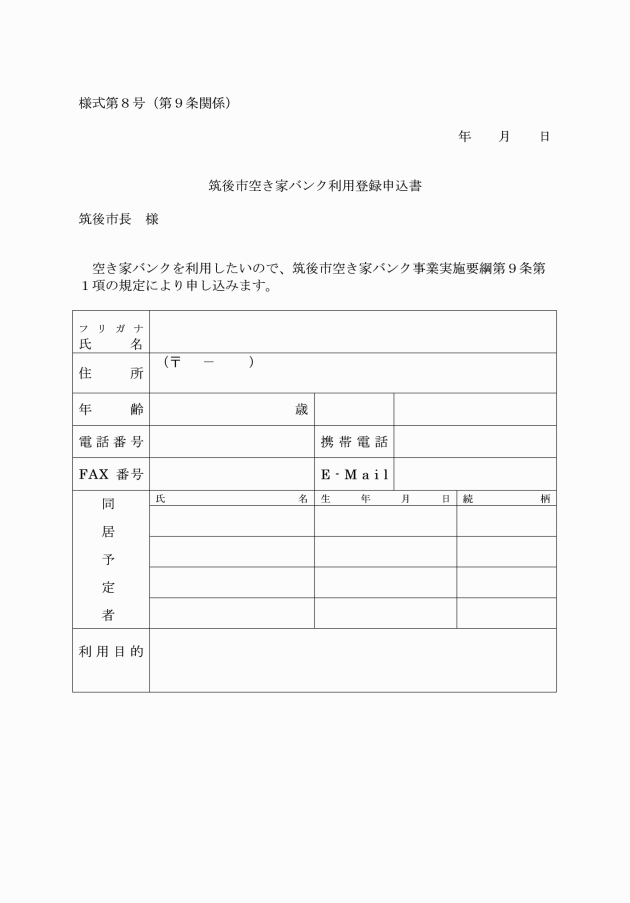 第1条 この要綱は、筑後市における空き家等の有効活用及び筑後市の定住人口の増加を図るため、市内に存在する空き家等の売却又は賃貸を希望する所有者等からの申込みを受け、登録した空き家等に係る情報を空き家等の利用を希望する者に紹介する筑後市空き家バンク事業(以下「空き家バンク」という。)の実施について必要な事項を定めるものとする。