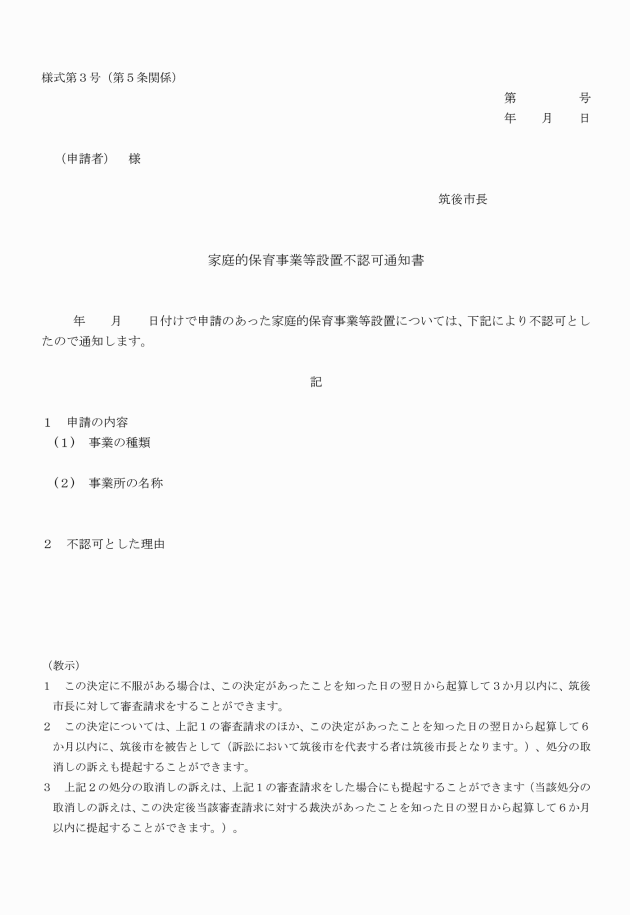 第3条 法第34条の15第2項の規定に基づき家庭的保育事業等の認可を受けようとする者は、事前に市長と協議した上で、家庭的保育事業等設置認可申請書(様式第1号)により申請を行わなければならない。
