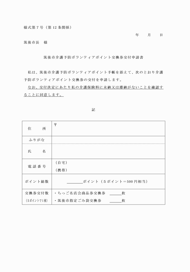 第12条 ポイントを活用して交換券の交付を受けようとする登録者(以下「申請者」という。)は、ポイント手帳及び筑後市介護予防ボランティアポイント交換券交付申請書(様式第7号)を市長に提出しなければならない。